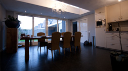 Aanbouw van een ruime keuken, speelkamer en overkapping. Voor meer daglicht in de keuken is een mooie lichtstraat ingebouwd.